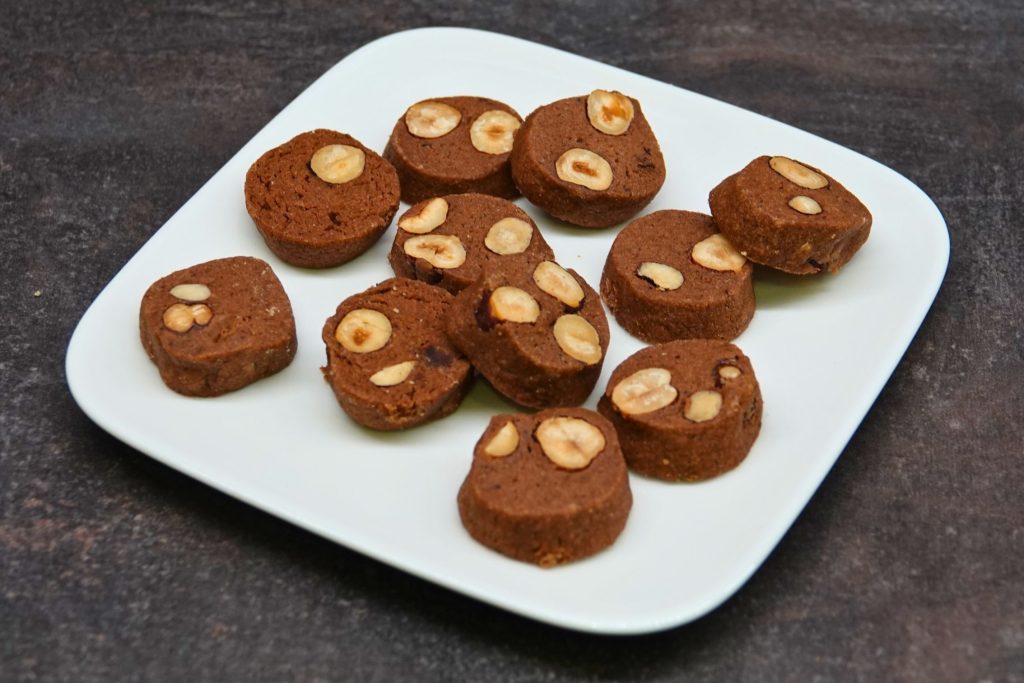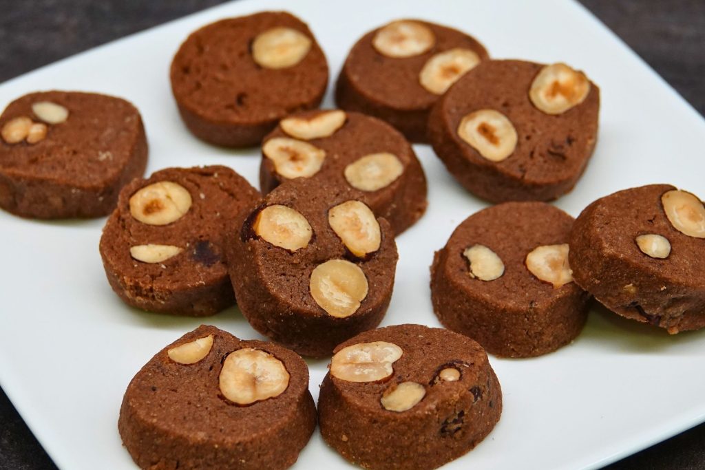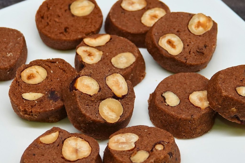 Složení: pšeničná mouka, máslo, lískové ořechy, cukr, žloutky, kakao